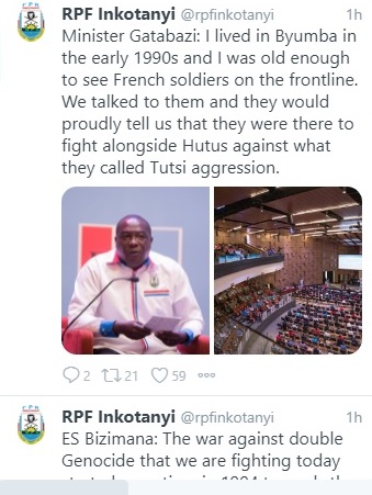 Ku rubuga rwa Twitter rw’Umuryango FPR-Inkotanyi handitse ko Minisitiri Gatabazi yagize ati: “ Mu myaka ya 1990 nabaga i Byumba kandi nari nkuze bihagije k’uburyo niboneye abasirikare b’Abafaransa ku rugamba. Twaraganiraga bakatubwira ko baje kurwana ku ruhande rw’Abahutu kugira ngo birukane Abatutsi bateye igihugu kandi babivugaga ubona nta ngingimira bafite  ku mutima.”