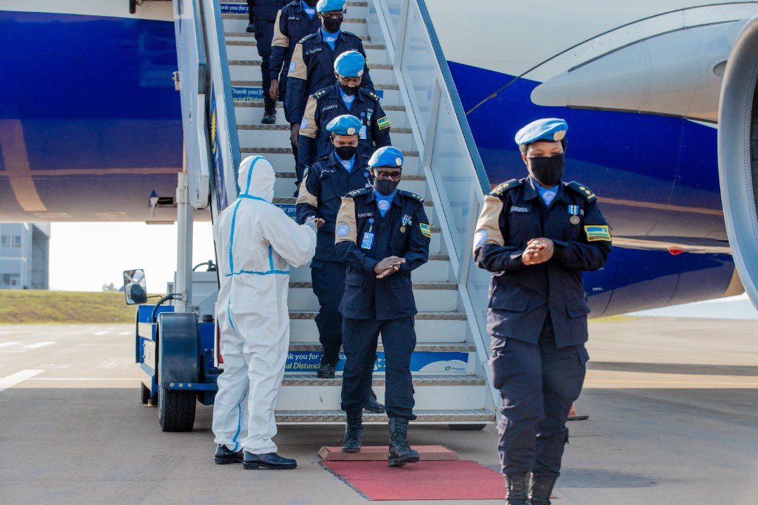 Ubwo bageraga i Kigali, babisikanye na bagenzi babo bagiye kubasimbura, aba bakaba bayobowe na Senior Superintendent of Police ( SSP) Marie Grâce Uwimana.