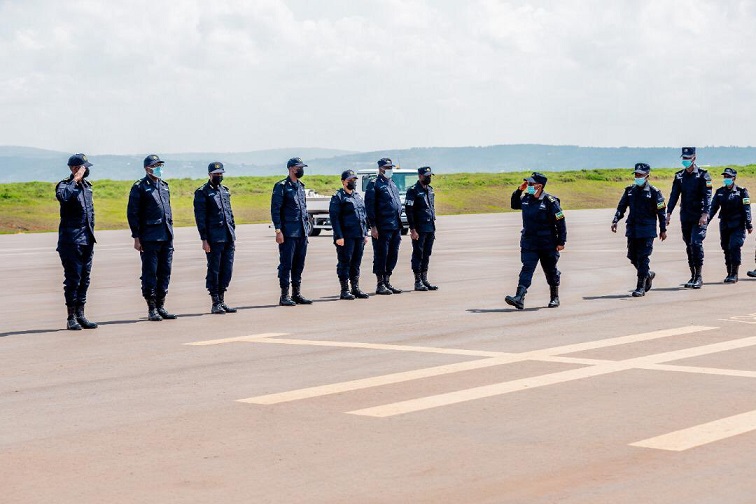Itsinda ry’abapolisi 143 bageze ku Kibuga cy’indege cya Kigali mu Murenge wa Kanombe muri Kicukiro mu masaha ashyira igicamunsi kuri iki Cyumweru tariki 07, Ugushyingo, 2021.