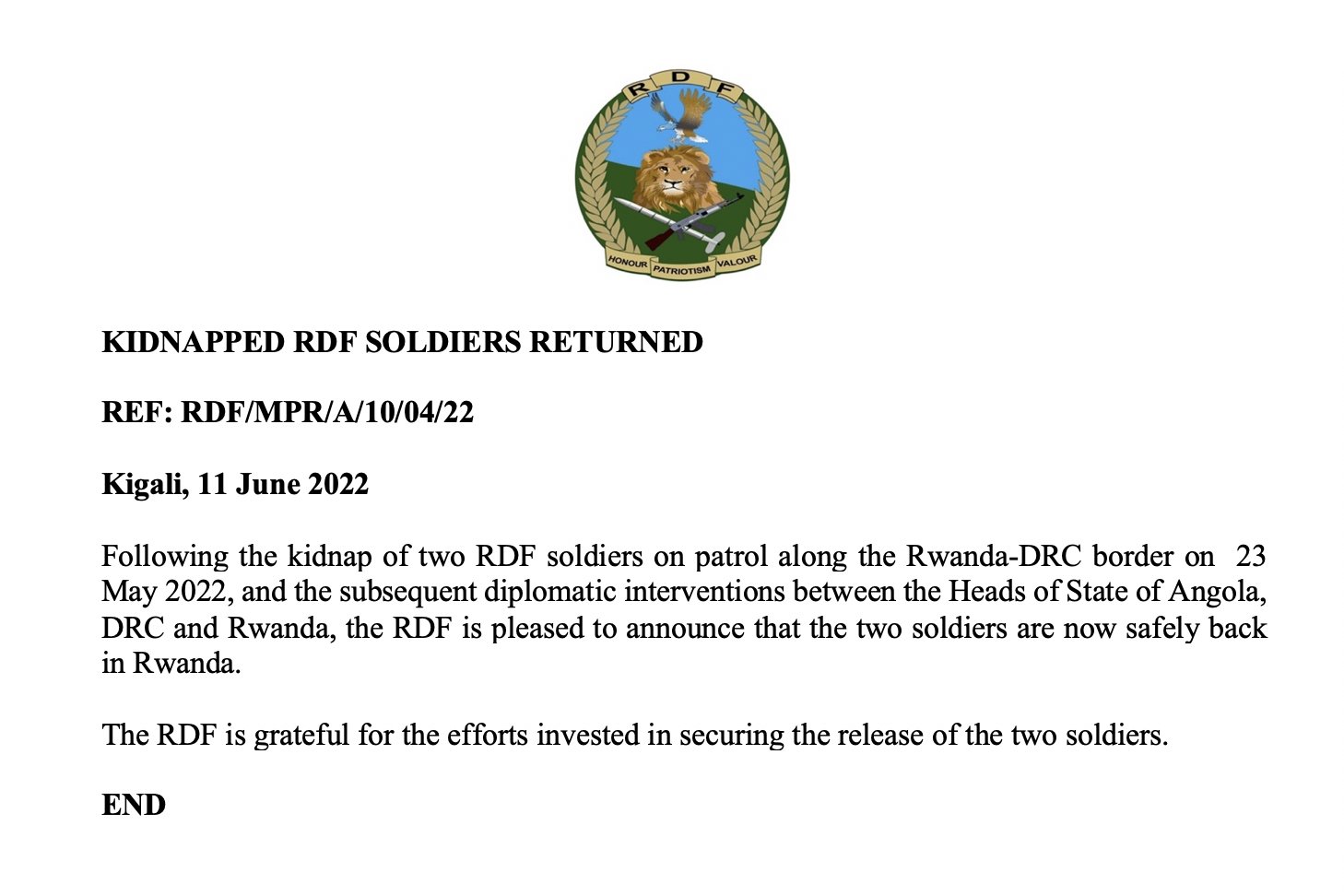 Minisiteri y’ingabo z’u Rwanda itangaza ko abasirikare babiri bari bamaze iminsi barashimuswe n’ingabo za Repubulika ya Demukarasi ya Congo ziri kumwe n’iza FDLR nk’uko itangazo ry’ingabo z’u Rwanda ryabivuze mu gihe gito cyatambutse, ubu bari mu Rwanda.