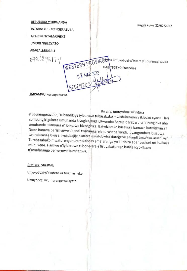 Nyuma yo kugeza ikibazo cyabo ku nzego z’ibanze ni ukuvuga Umurenge n’Akarere, baje kwandika ibaruwa basobanurira Guverineri w’Intara y’i Burengerazuba uko ikibazo cyabo giteye, bayiha bamwe muri bo bayijyana ku Biro by’Intara.