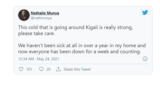 Yanditse ati: “ Ibi bicurane na grippe biri i Kigali birakaze, mwitonde! Twari tumaze umwaka urenga iwanjye tutabirwara ariko ubu hafi ya twese turi gukorora”