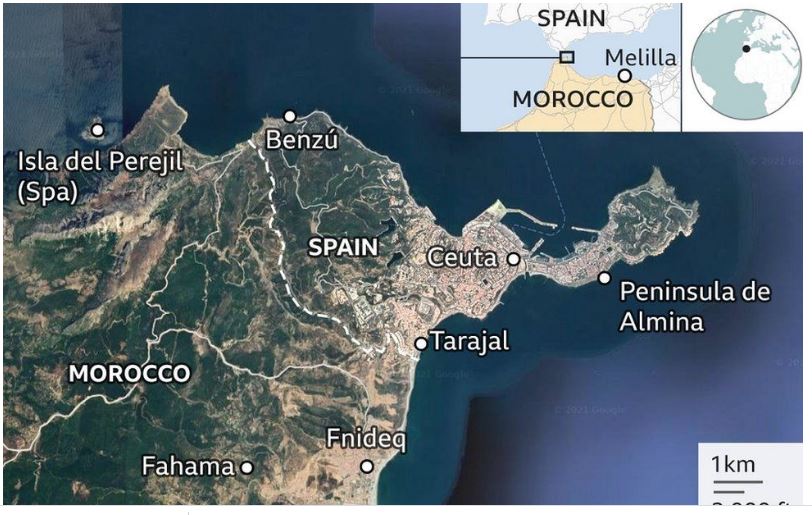 Mu bimukira 8000 bageze ku mwaro wa Ceuta ( côte, coast) wo ku Nyanja ya Mediterannée ihuza Maroc na Espagne, abagera ku 2000 ni abana bataruzuza imyaka 18 y’amavuko kandi hari benshi muri bob amaze gusubizwayo na Polisi ishinzwe kurinda amazi ya Espagne.
