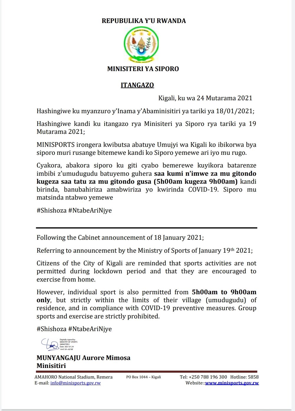 Commissioner of Police Rumanzi yavuze biriya hashize hafi amasaha abiri n’igice Minisiteri ya Siporo n’Umuco ibujije abatuye Kigali gukora Siporo mu mugoroba ahubwo bakajya bayikora mu gitondo guhera saa kumi n’imwe za mu gitondo(5h00am) kugeza saa tatu za mu gitondo(9h00am).
