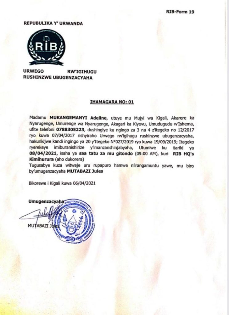 Nyuma yo guhamagazwa n’Urwego rw’Igihugu rw’Ubugenzacyaha, RIB, Madamu Adeline Mukangemanyi Rwigara ntiyarwitabye. Yari yabibwiye Radio Ijwi ry’Amerika mu gitondo cyo kuri uyu wa Kane ko atari bwitabe kubera ko, kimwe n’abandi Banyarwanda, ari kwibuka Jenoside yakorewe Abatutsi.