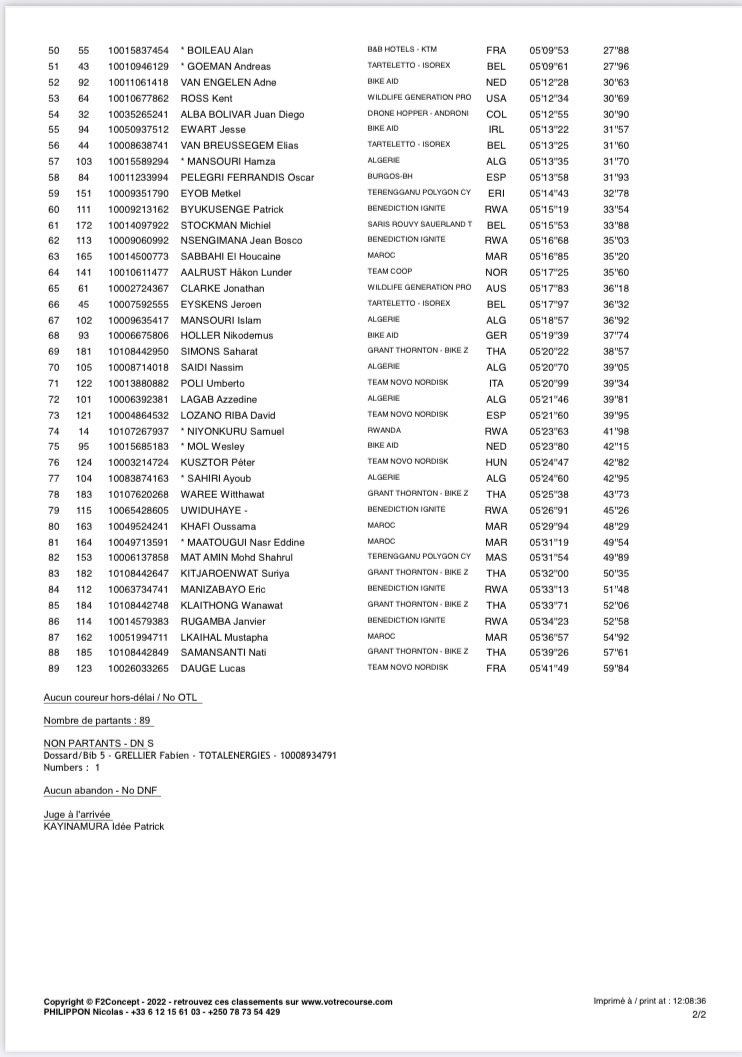 Ku mwanya wa kabiri haje Restrepo Valencia Jhonathan ukinira Drone Hopper – Androni wakoresheje iminota 4’47’’34, bivuze ko uwa mbere yamueushije imiota 4’69’’. Ku mwanya wa gatatu haje undi mukinnyi wa TotalEnergies, Dujardin Sandy, we wakoresheje iminota 04’48’’28.