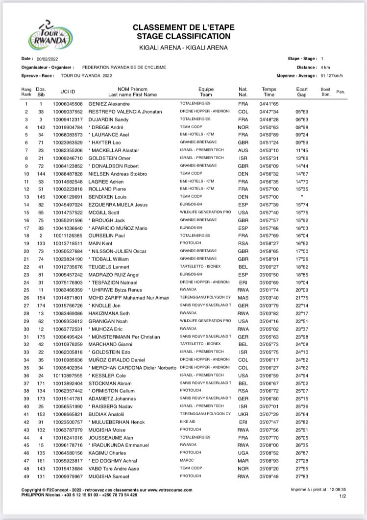Alexandre Geniez ukinira TotalEnergies yo mu Bufaransa ni we wegukanye agace ka mbere ka Tour du Rwanda 2022, akoresheje iminota 4’41”65, aho abasiganwa bazengurutse Kigali Arena mu ntera ya kilometero 4.