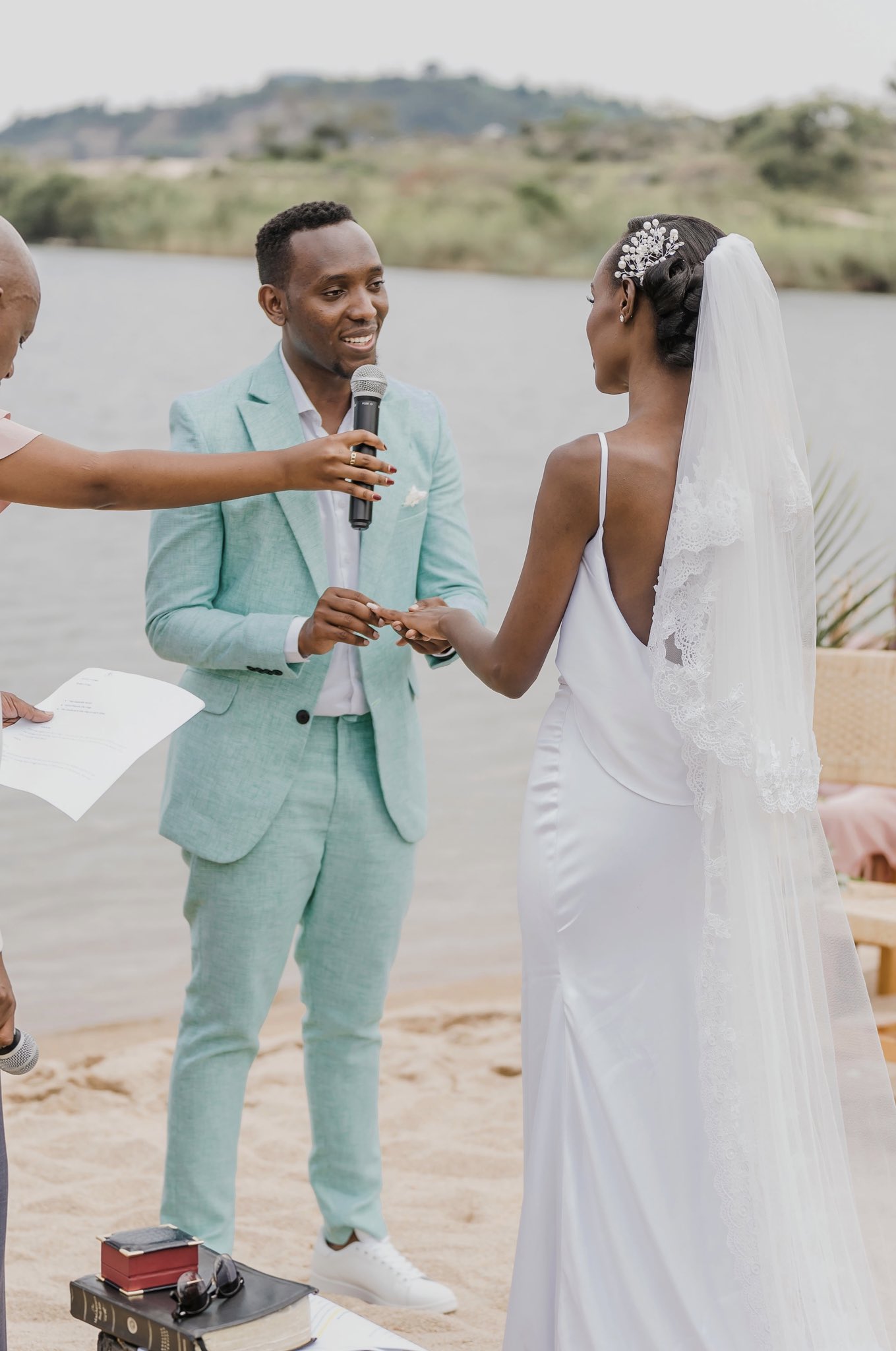 Nta bantu benshi bari bahari, kandi nyuma yo kwambikana impeta, buriye ubwato burabatembereza mu mazi y’ikiyaga cya Kivu.