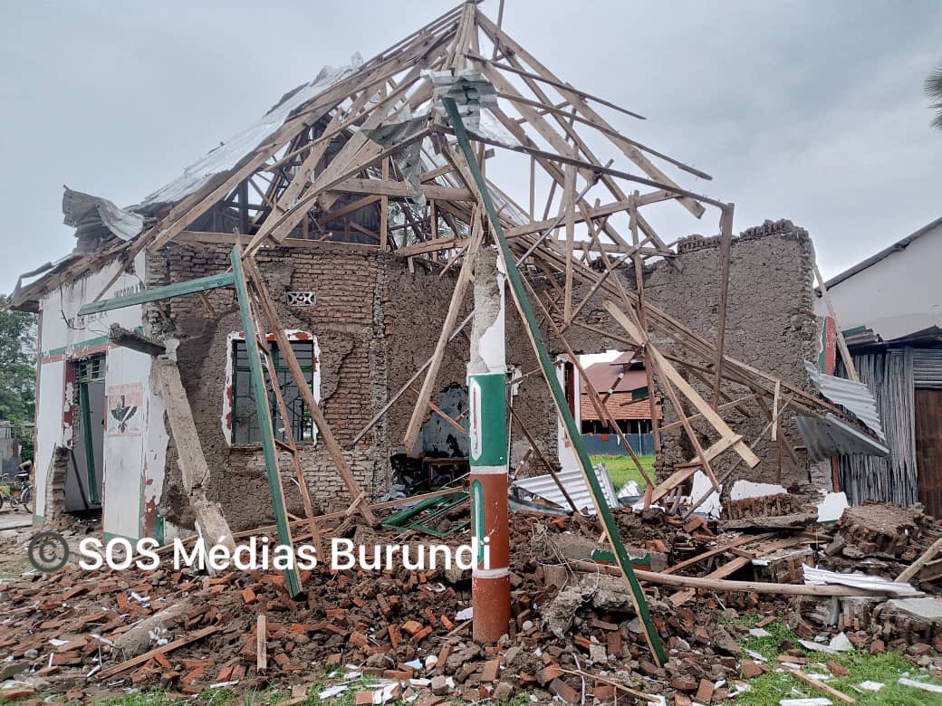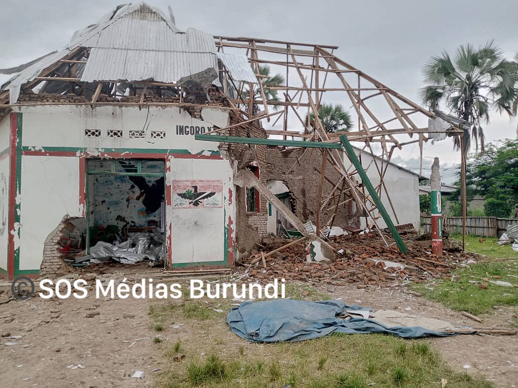 Aho mafoto yasohowe na SOS Media Burundi arerekana inzu y’Ibiro bya CNDD-FDD byasenywe uruhande rumwe n’igisasu cya roquette ndetse n’imodoka z’amakamyo zatwitswe.