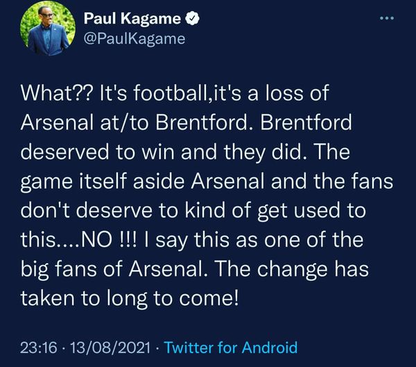 Ni nyuma y’uko ku wa Gatanu ushize ikipe yitwa Brentford yatsindaga Arsenal 2-0 bikababaza abafana hirya no hino ku isi harimo na Perezida Paul Kagame w’u Rwanda.