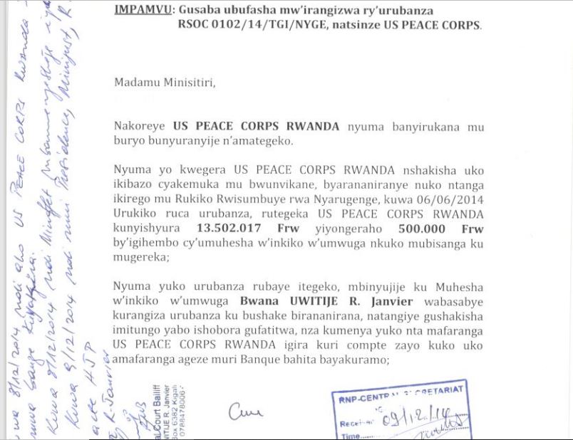 Muri iriya baruwa dufitiye kopi handitsemo ko umuhesha w’inkiko yasanze nta bushake bwo kurangiza urubanza US PEACE CORPS ifite, atangira gushaka uko yazagwatiriza imwe mu mitungo yayo ariko asanga imodoka zayo zifite ibirango bya CD (Corps diplomatique) kandi ntizigwatirizwa.