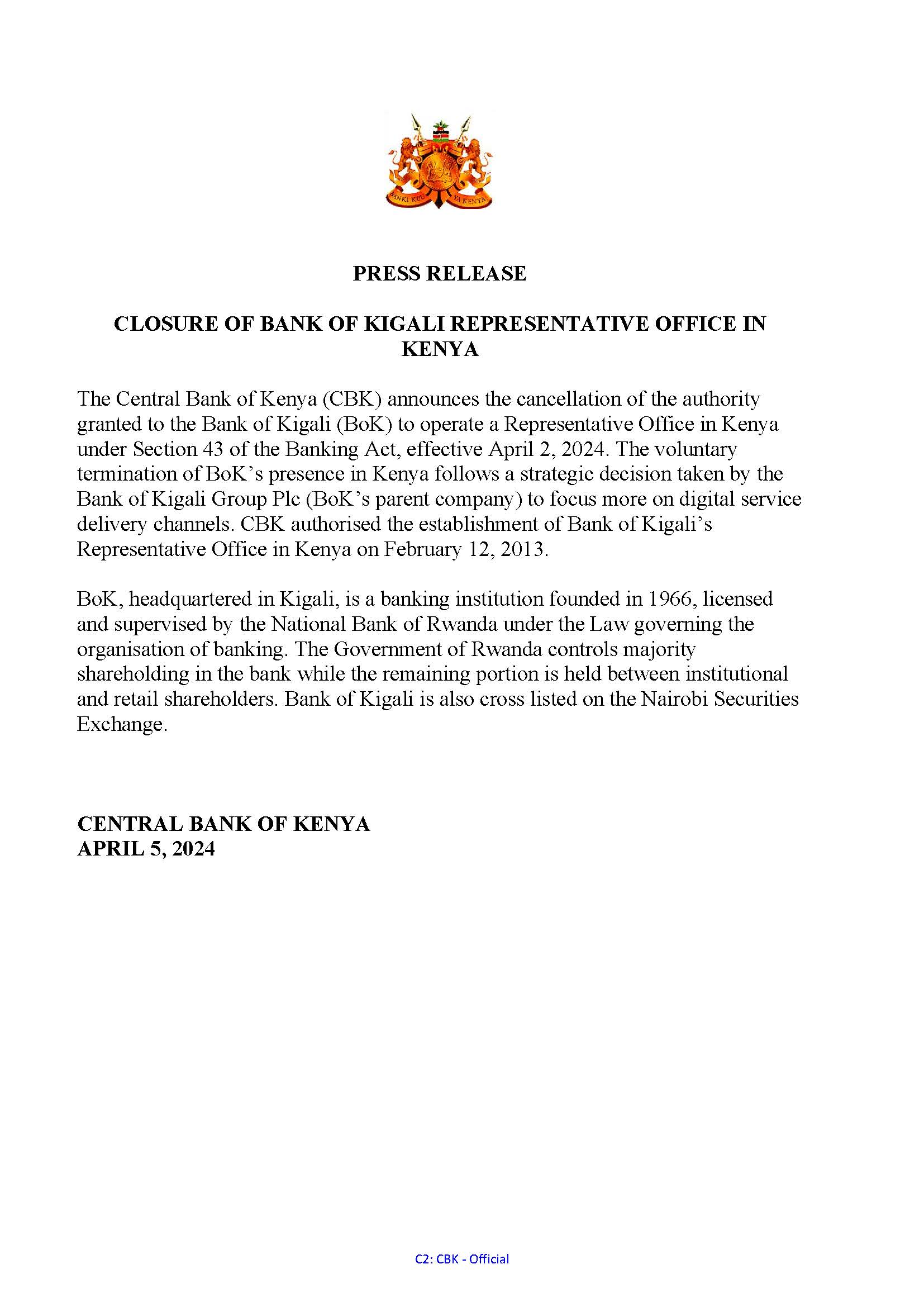 Itangazo ry’uko iri shami rya Banki ya Kigali rifunzwe rigira riti: “ Banki nkuru ya Kenya iramenyesha abantu bose ko ibyangombwa byemereraga Banki ya Kigali ishami rya Kenya gukomeza gukora bitagikora. Ni icyemezo gishingiye ku ngingo ya 43 igenga za Banki yitwa Banking Act”.