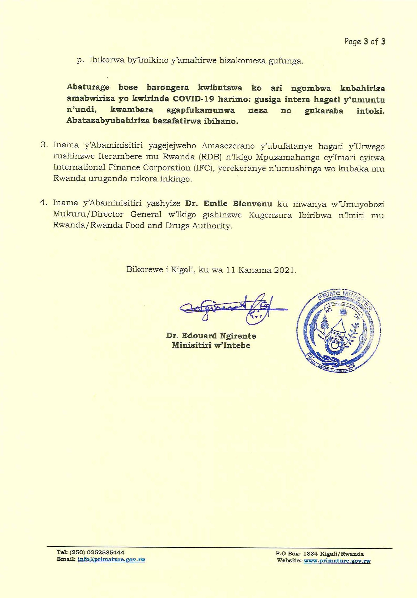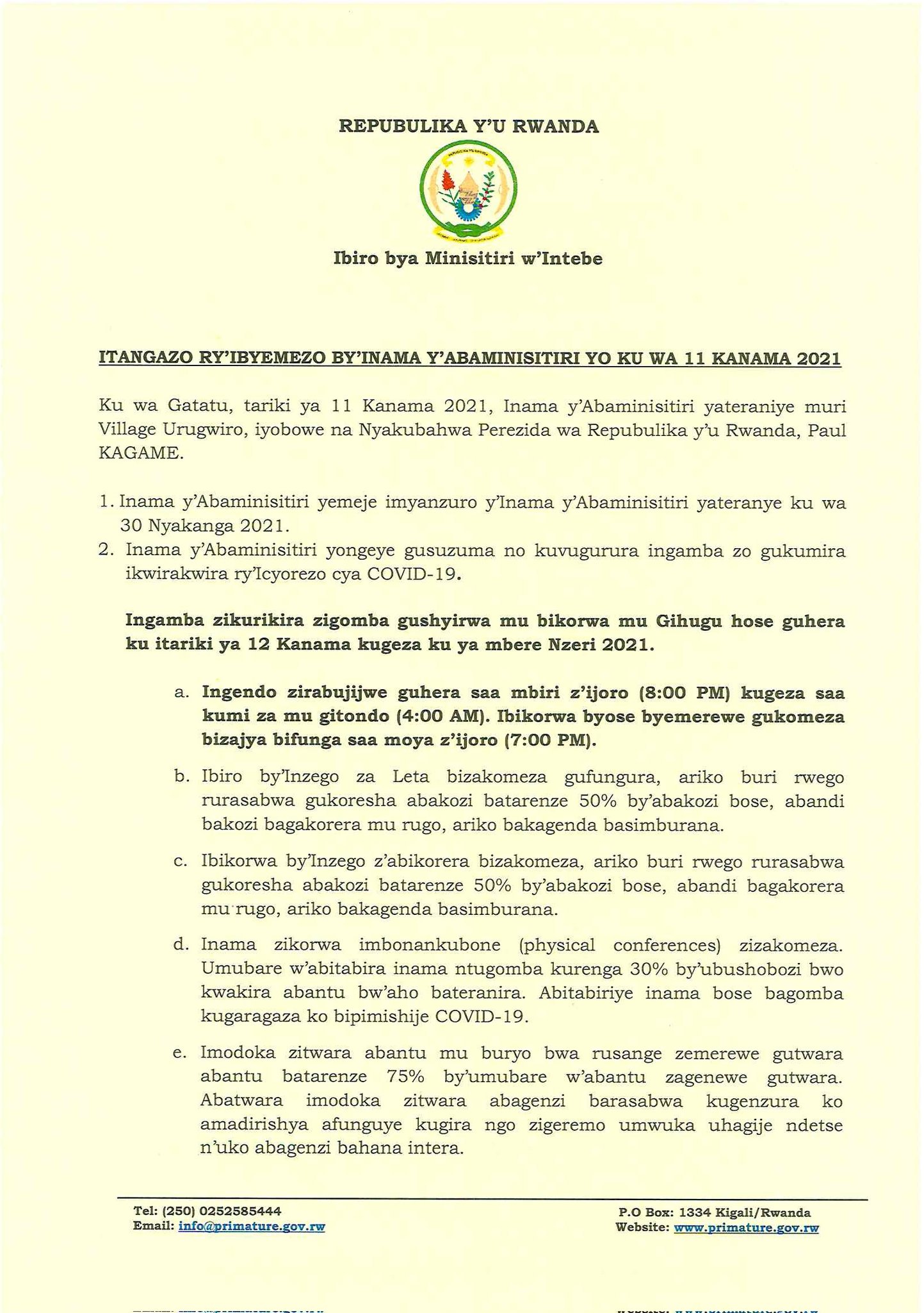 Ni ingamba zigomba gushyirwa mu bikorwa mu gihugu hose guhera ku wa 12 Kanama kugeza ku wa 1 Nzeri 2021. Ajyanye n’imibare y’ubwandu bushya imaze iminsi yaragabanyutse, cyane cyane mu Mujyi wa Kigali.