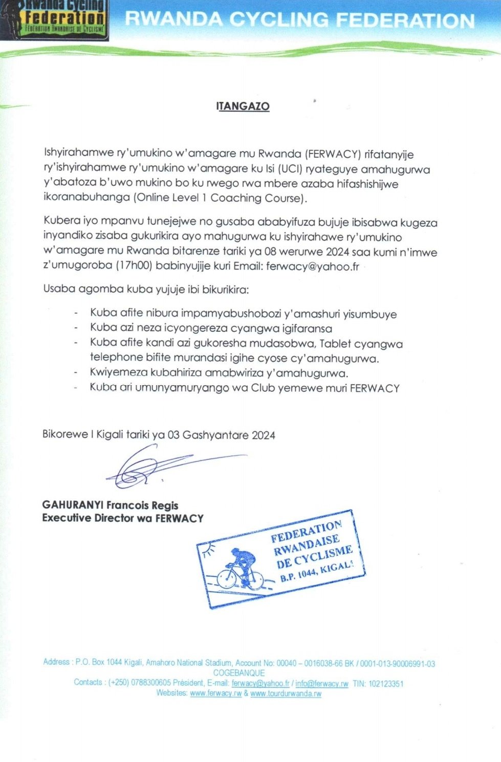 FERWACY ivuga ko abantu bashaka gutoza umukino w’igare bagomba kuba barangije gutanga ibisabwa bitarenze taliki 08, Werurwe, 2024 ni ukuvuga ku wa Gatanu w’Icyumweru kizarangira taliki 10, Werurwe, 2024.