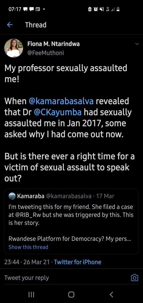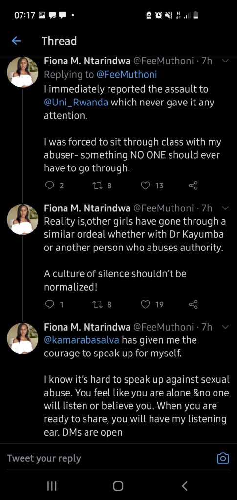 Fiona Muthoni Ntarindwa yunzemo ati: “Ukuri ni uko, hari abandi bakobwa banyuze mu bintu nk’ibi yaba ari Kayumba wabahohoteye cyangwa se undi muntu witwaza icyo aricyo. Umuco wo guceceka ntukwiye kwimakazwa.”