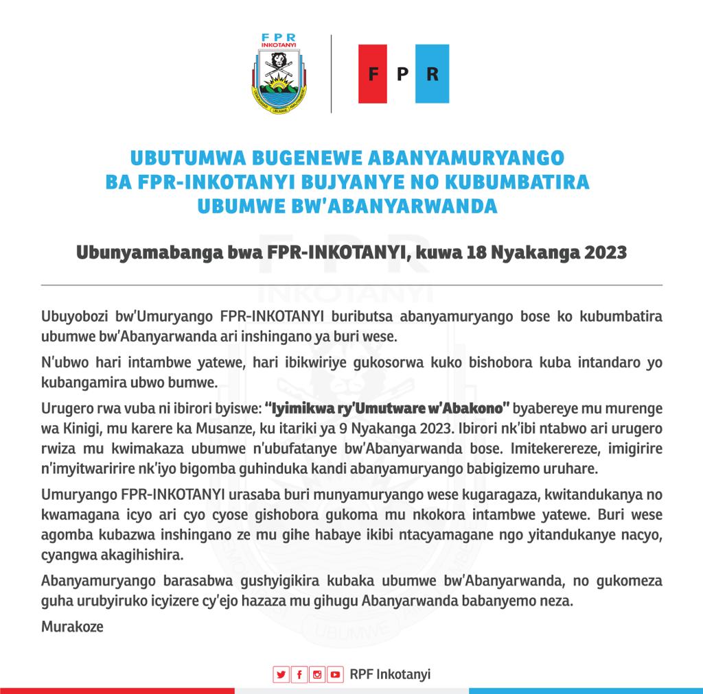 Itangazo ry’Umuryango FPR Inkotanyi ryasohowe kuri uyu wa Kabiri taliki 18, Nyakanga, 2023 riramagana abanyamuryango baherutse gukora icyo bise ‘Iyimikwa ry’Umutware w’Abakono’ cyabereye muri Musanze kuko gishobora kubangamira ubumwe bw’Abanyarwanda.