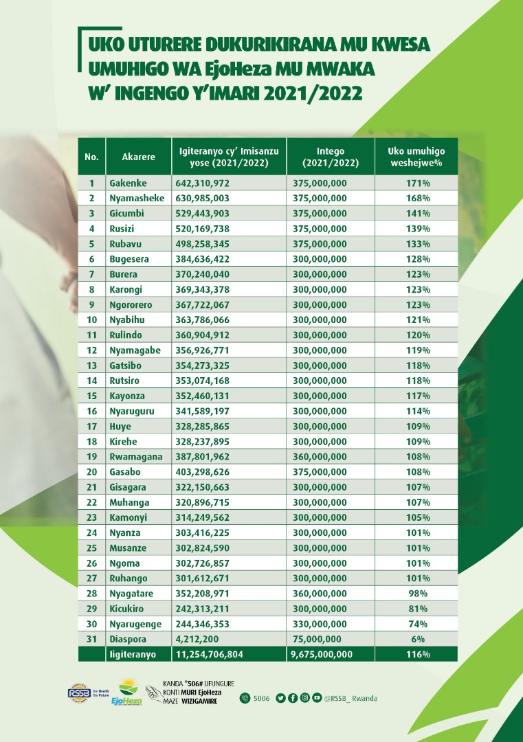 Ikigo cy’igihugu gishinzwe ubwiteganyirize, RSSB, cyatangaje ko Akarere ka mbere gafite abaturage biteganyirije muri Gahunda ya Ejo Heza ari benshi kurusha abandi ari Gakenke. Abatuye Gakenke bizigamiye Miliyoni Frw 642.3.