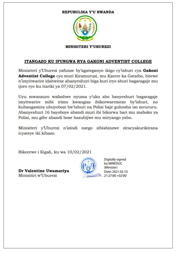 Kuri uyu wa Gatatu nibwo Minisiteri y’uburezi yatangaje ko ishuri rya Gakoni Adventist College rifunzwe kubera ‘imyitwarire mibi y’abanyeshuri irimo kwangiza ibikorwa remezo no kubangamira ubuyobozi bw’ishuri na Polisi’ yari yaje guhosha iriya myigaragambyo.