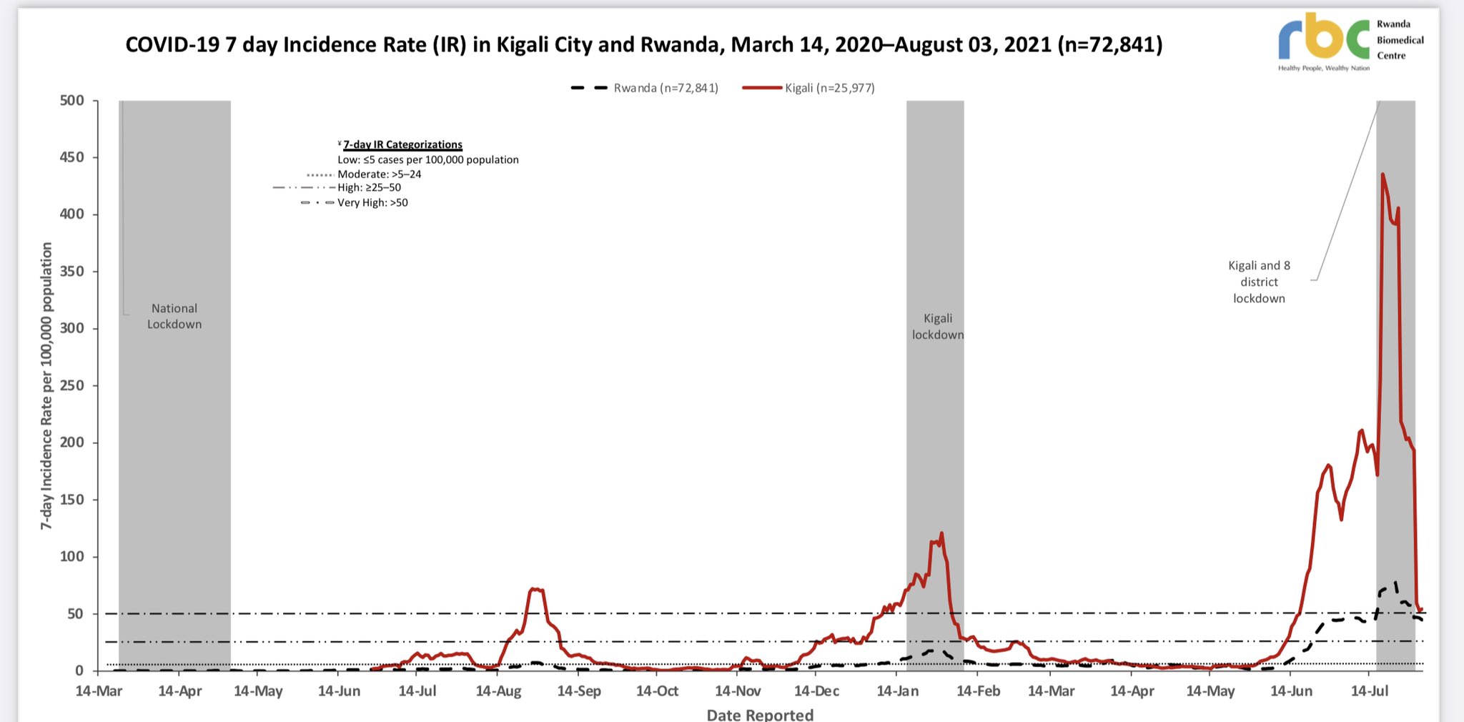 Ku wa 25 Nyakanga Guverinoma yatangaje ko mu rwego rwo gushimangira intambwe imaze guterwa mu kugabanya umubare w’abanduye n’abapfa, yongereye iminsi itanu kuri guma mu rugo mu Mujyi wa Kigali n’Uturere umunani.