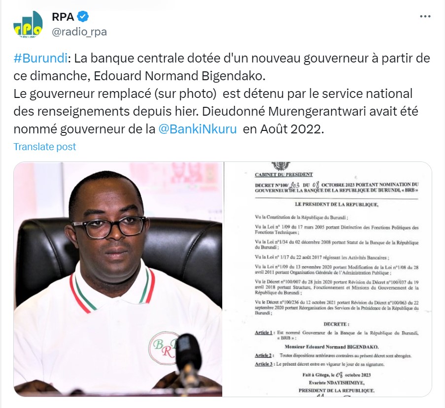 Itangazo ryasohowe n’Ibiro bya Perezida w’Uburundi rivuga ko hashingiwe ku mategeko agena uko Guverineri wa Banki Nkuru y’Uburundi ashyirwaho, Edouard Normand Bigendako yashyizweho ngo abe ari we uyiyobora, akaba asimbuye Dieudonne Murengerantwari .