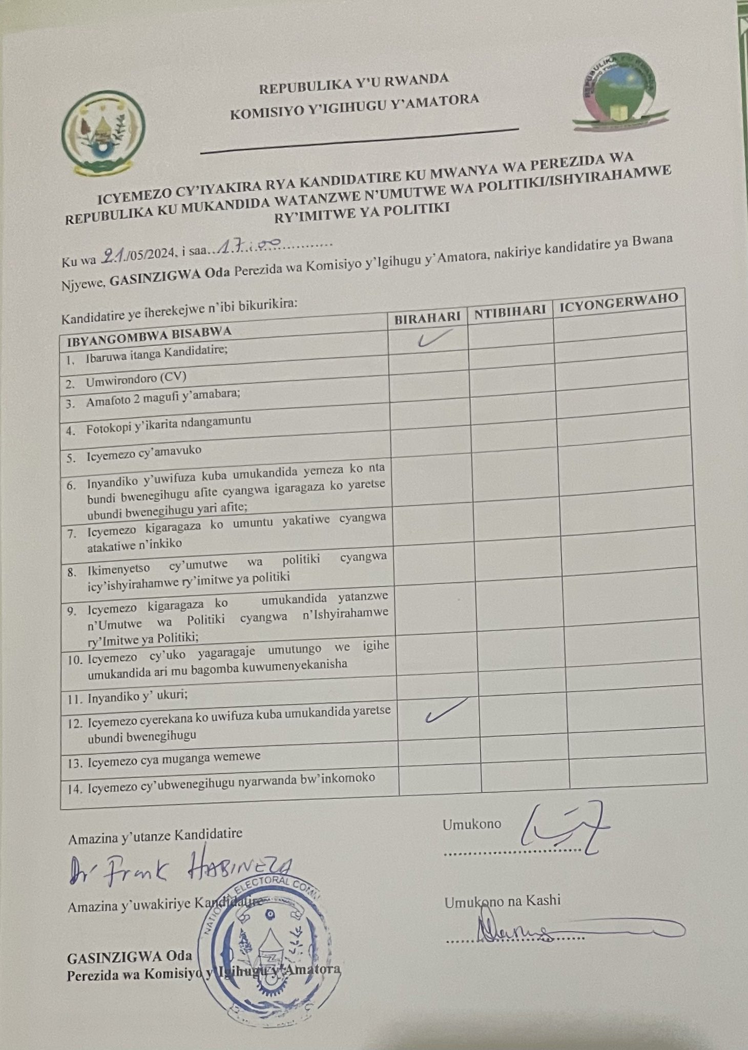 Ku rukuta rwe rwa X, Dr. Frank Habineza yatangaje ko yagejeje kuri Komisiyo y’amatora inyandiko ebyiri zaburaga mu idosiye yo gusaba kwemererwa kwiyamamariza kuba Perezida wa Repubuka mu matora abura igihe gito ngo abe.