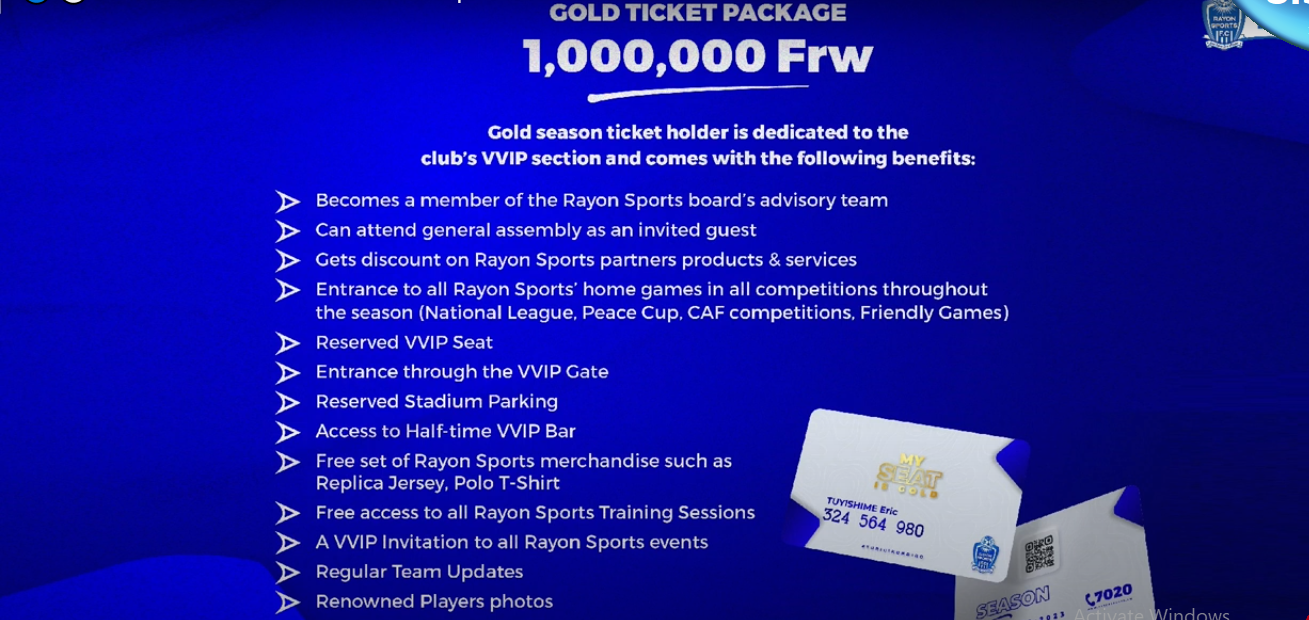 Namenye Patrick ushinzwe imishinga n’ubucuruzi muri Rayon Sports yatangaje ko itike y’umwaka wose ya “Gold” ya Miliyoni Frw1 yaguzwe na Perezida w’Umuryango wa Rayon Sports, Uwayezu Jean Fidèle, iya kabiri igurwa n’Umubitsi, Ndahiro Olivier.