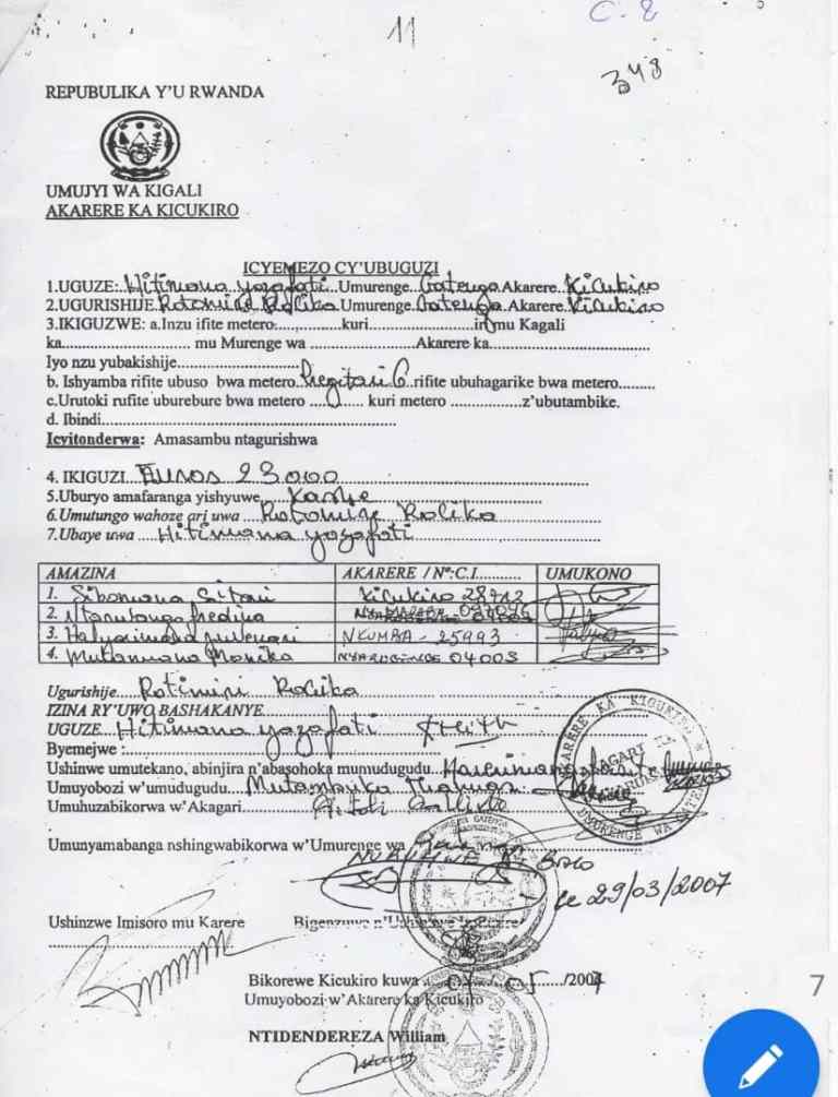 Ayo masezerano yujujwe n’icyemezo cy’igura ry’ubutaka cyatanzwe n’Ubuyobozi bw’Akarere ka Kicukiro, mu mazina ya Hitimana.