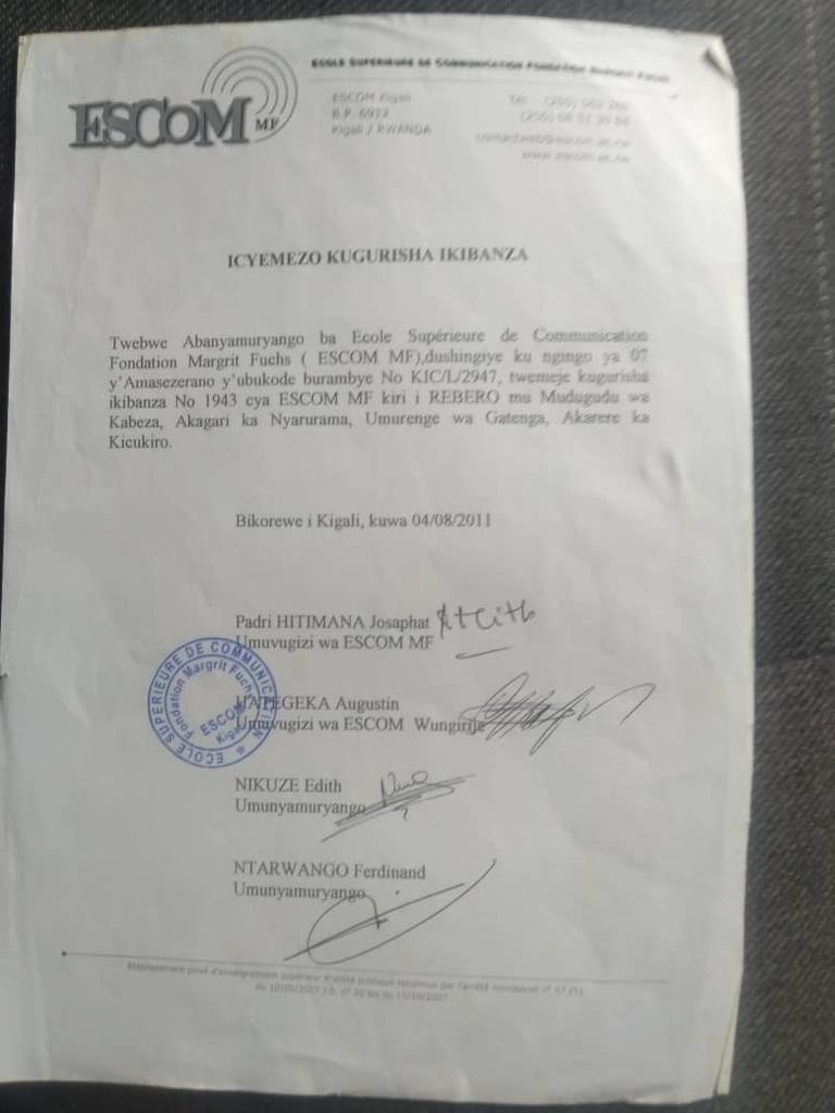 Igira iti “Twebwe Abanyamuryango ba Ecole Supérieure de Communication Fondation Margrit Fuchs (ESCOM MF), dushingiye ku ngingo ya 07 y’amasezerano y’ubukode burambye No KIC/L/2947, twemeje kugurisha ikibanza No 1943 cya ESCOM MF kiri i Rebero mu Mudugudu wa Kabeza, Akagari ka Nyarurama, Umurenge wa Gatenga, Akarere ka Kicukiro.”