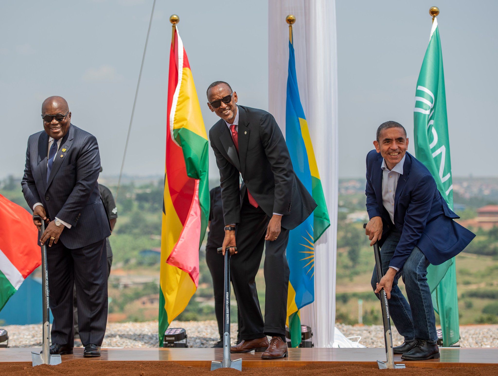 Umukuru w’u Rwanda Paul Kagame hamwe na bagenzi barimo uyobora Ghana, Nana Akufo Addo, uyobora Guyana witwa Irfaan Ali, umuyobozi mukuru wa BioNTech Uğur Şahin, Perezida wa Komisiyo y’Umuryango wa Afurika Yunze Ubumwe, Moussa Faki Mahamat n’abandi bayobozi bashyize ibuye ahagiye kuzubakwa uruganda rukora inkingo mu Rwanda.