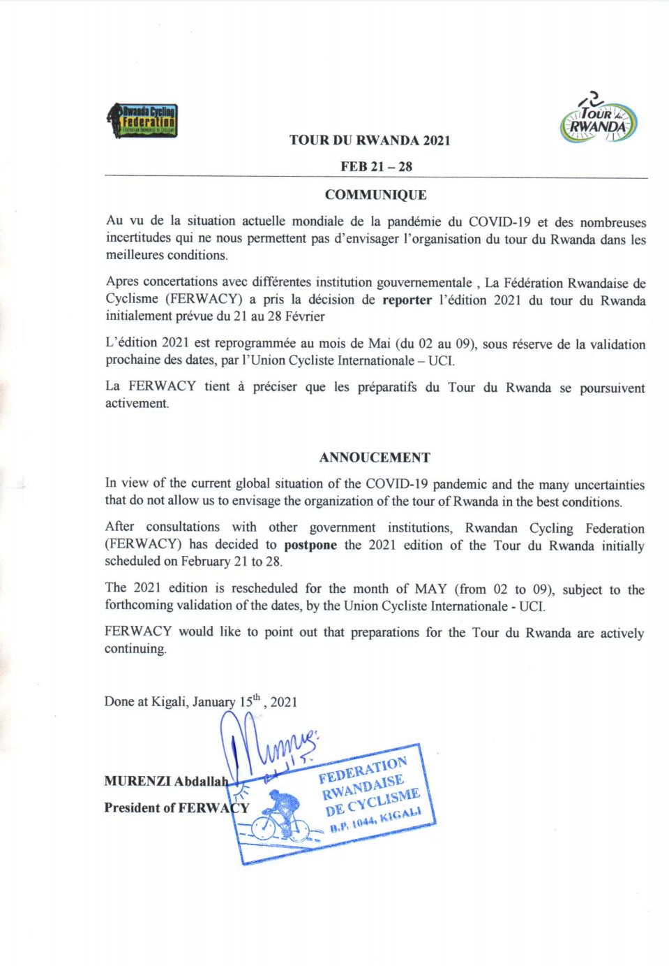 Ubukana bwa COVID-19 muri iki gihe byatumye ibintu byinshi bihagarikwa ibindi birasubikwa. Ubu hasohotse itangazo rivuga ko Tour du Rwanda 2021 yari riteganyijwe muri Gashyantare 2021 yimuriwe tariki 2-9 Gicurasi 2021 bitewe n’ubukana COVID19.