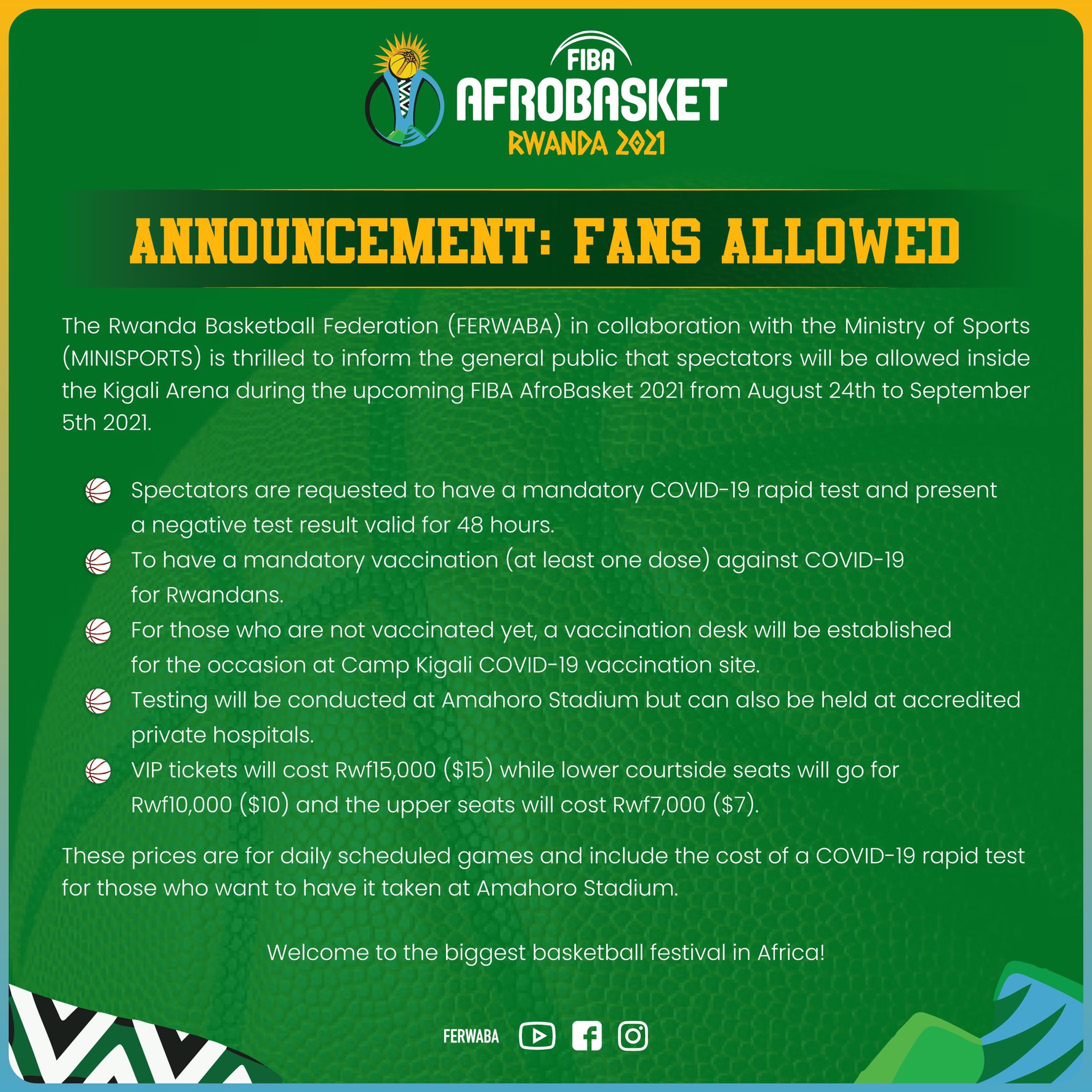 Federasiyo y’Umukino wa Basket mu Rwanda, FERWABA yatangaje ko abafana bipimishije COVID-19 bagasanga bataranduye bakaba barakingiwe byibura inshuro imwe bazemererwa kureba imikino y’amarushanwa y’umukino wa Basket nyafurika azabera muri Kigali Arena guhera tariki 24, Kanama, 2021.