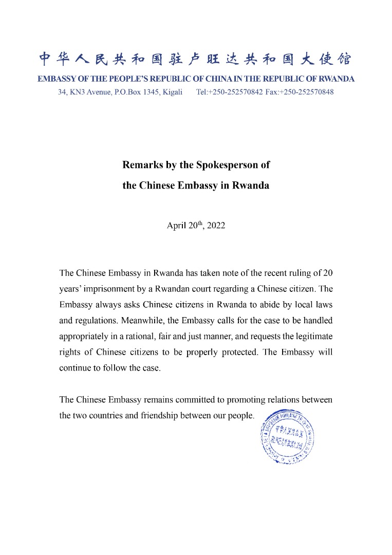 Itangazo Ambasade y’u Bushinwa yahaye ubwanditsi bwa Taarifa rivuga ko iki igihugu buri gihe gisaba abaturage bacyo baba mu Rwanda gukurikiza amategeko agenda abarutuye.