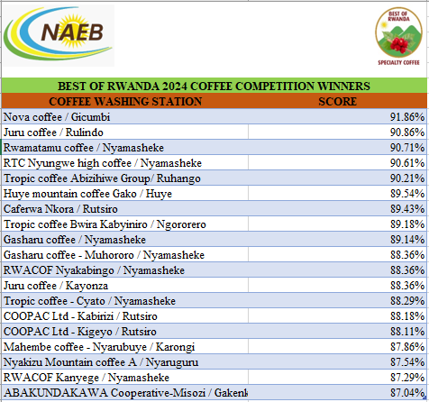 Ikawa yahize izindi ni iya Koperative yitwa Nova Coffee yo mu Karere ka Gicumbi yagize ijanisha rya 91.86%, ikurikirwa n’ikawa yo muri Rulindo yitwa Juru Coffee yagize 90.86% hakurikiraho iyo muri Nyamasheke yitwa Rwamatamu Coffee yagize 90.71%.
