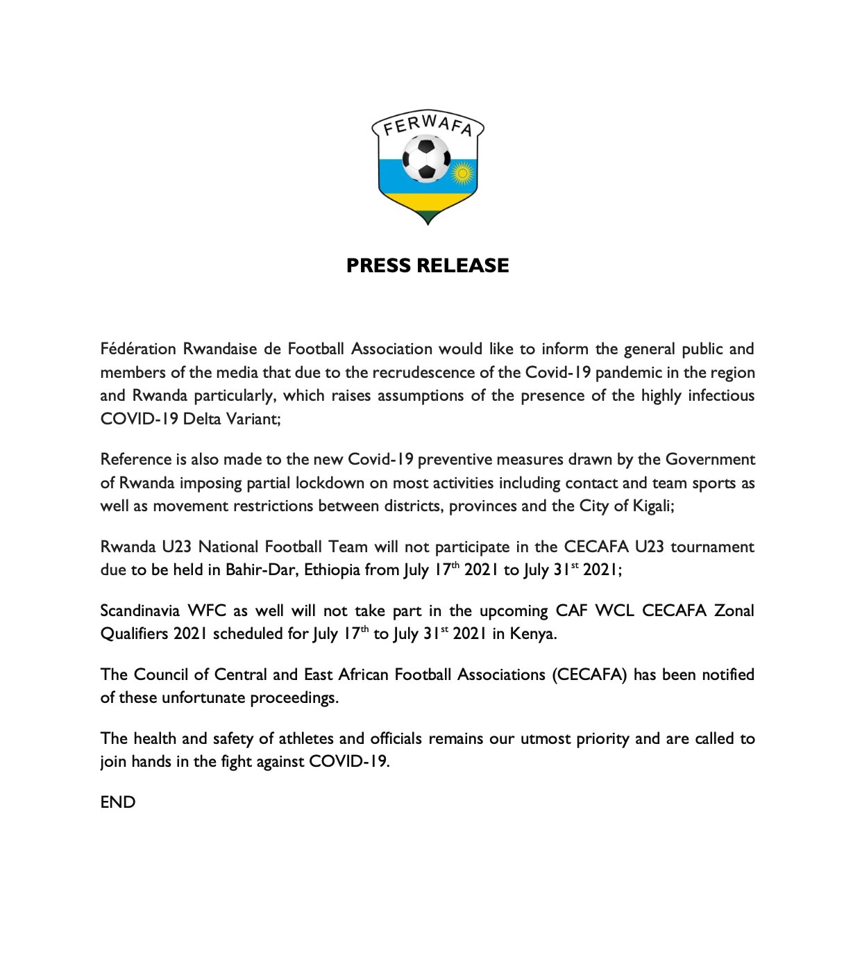 FERWAFA yabitangaje mu itangazo rigenewe abanyamakuru yacishije kuri Twitter ku mugoroba wo kuri uyu wa Gatanu tariki 09, Nyakanga, 2021.