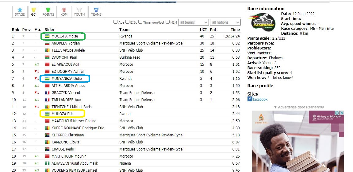 Moïse Mugisha atwaye Tour du Cameroun mu gihe mu mwaka wa 2020 yigeze no gutwara isiganwa ryo muri kiriya gihugu ryitwa Tour Chantal Biya.
