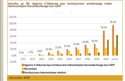 BNR: Nk’uko imibare yatanzwe hejuru ibyerekana, kwishyurana hakoreshejwe ikoranabuhanga bigenda bikoreshwa cyane mu Rwanda; ibi bikagaragazwa n’uko muri rusange umubare w’amafaranga yahererekanyijwe mu buryo bw’ikoranabuhanga uwugereranyije n’umusaruro mbumbe w’imbere mu gihugu (GDP) wazamutse ugera kuri 95.5% muri Kamena 2021 uvuye kuri 34.6% muri 2019.