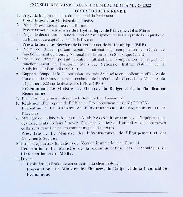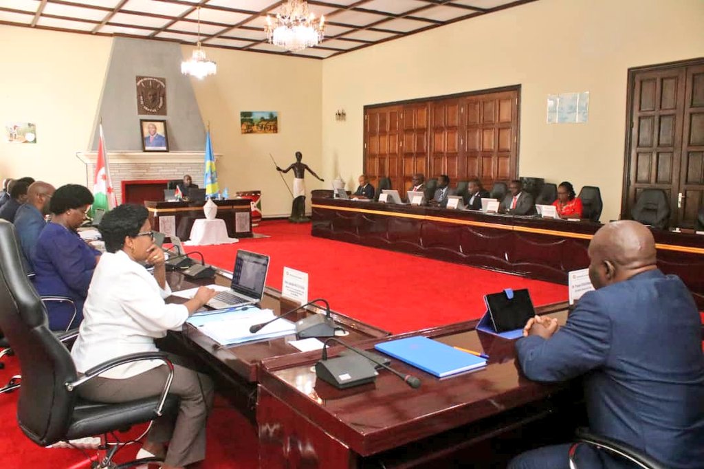 Les membres du Gouvernement du #Burundi se réunissent en Conseil des Ministres au Palais Présidentiel de @Gitega sous la présidence du Chef de l’Etat SE Evariste #Ndayishimiye. Dix projets de loi sont à l’ordre du jour dont le Projet de Politique Minière du Burundi. pic.twitter.com/fXKldKkvH2