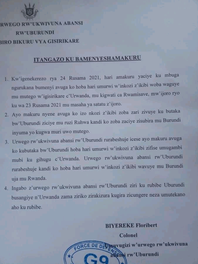 Iri tangazo rirangiza rivuga ko ingabo z’u Burundi zihora ku mupaka ubugabanya n’u Rwanda zicunga ko ntawahahungabanyiriza umutekano waba uw’u Rwanda, uw’u Burundi cyangwa uw’ahandi.