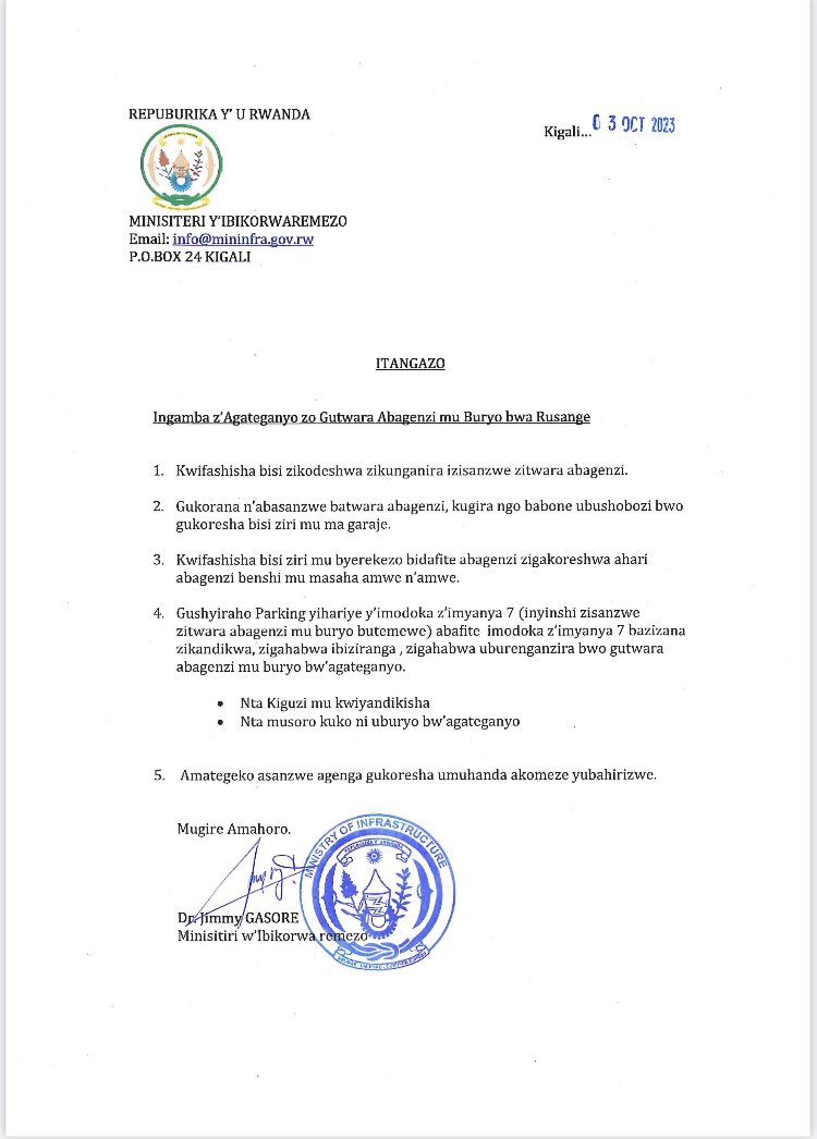 Minisitiri y’ibikorwa remezo yasohoye amabwiriza y’uko hagiye kubaho uburyo bushya bwo gutwara abagenzi mu Mujyi wa Kigali. Kimwe mu byo aya mabwiriza ateganya ni uko hagiye gushyirwaho parikingi yihariye y’imodoka z’imyanya irindwi zizajya zifashishwa mu gutwara abagenzi by’agateganyo.