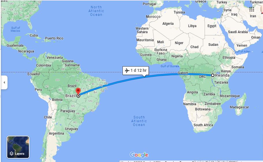Ni intera ndende koko kubera ko kuva i Kigali ujya Rio de Janeiro muri Brazil ari ibilometero 9,050 mu gihe kuva i Kigali ujya Canberra muri Australia ari ibilometero 11, 304.
