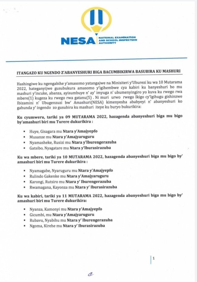 Itangazo ry’Ikigo cy’Igihugu gishinzwe Ibizamini n’Ubugenzuzi bw’Amashuri (NESA), rivuga ko abanyeshuri bazagenda ku ikubitiro ari abiga mu bigo byo mu Turere twa Huye mu Ntara y’Amajyepfo, Musanze mu Ntara y’Amajyaruguru, Nyamasheke na Rusizi mu Ntara y’i Burengerazuba ndetse n’abiga muri Gatsibo na Nyagatare mu Ntara y’i Burasirazuba.