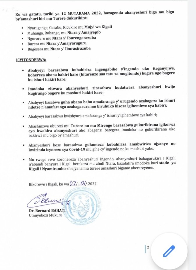 Itangazo ryasohowe kuri uyu wa Gatanu tariki 07, Mutarama, 2022 riturutse mu Biro bya Minisitiri w’Intebe bya Minisitiri w’Intebe niryo ryatangarijwemo uko amashuri azafungura mu Gihembwe cya kabiri.