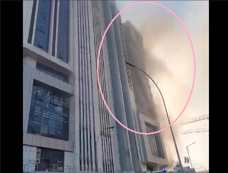 Amashusho yashyizwe kuri X, arerekana inyubako yamwitiriwe iri gucumba umwotsi ku gice cyo hejuru, akanerekana za kizimyamwoto za Polisi zaje gutabara.