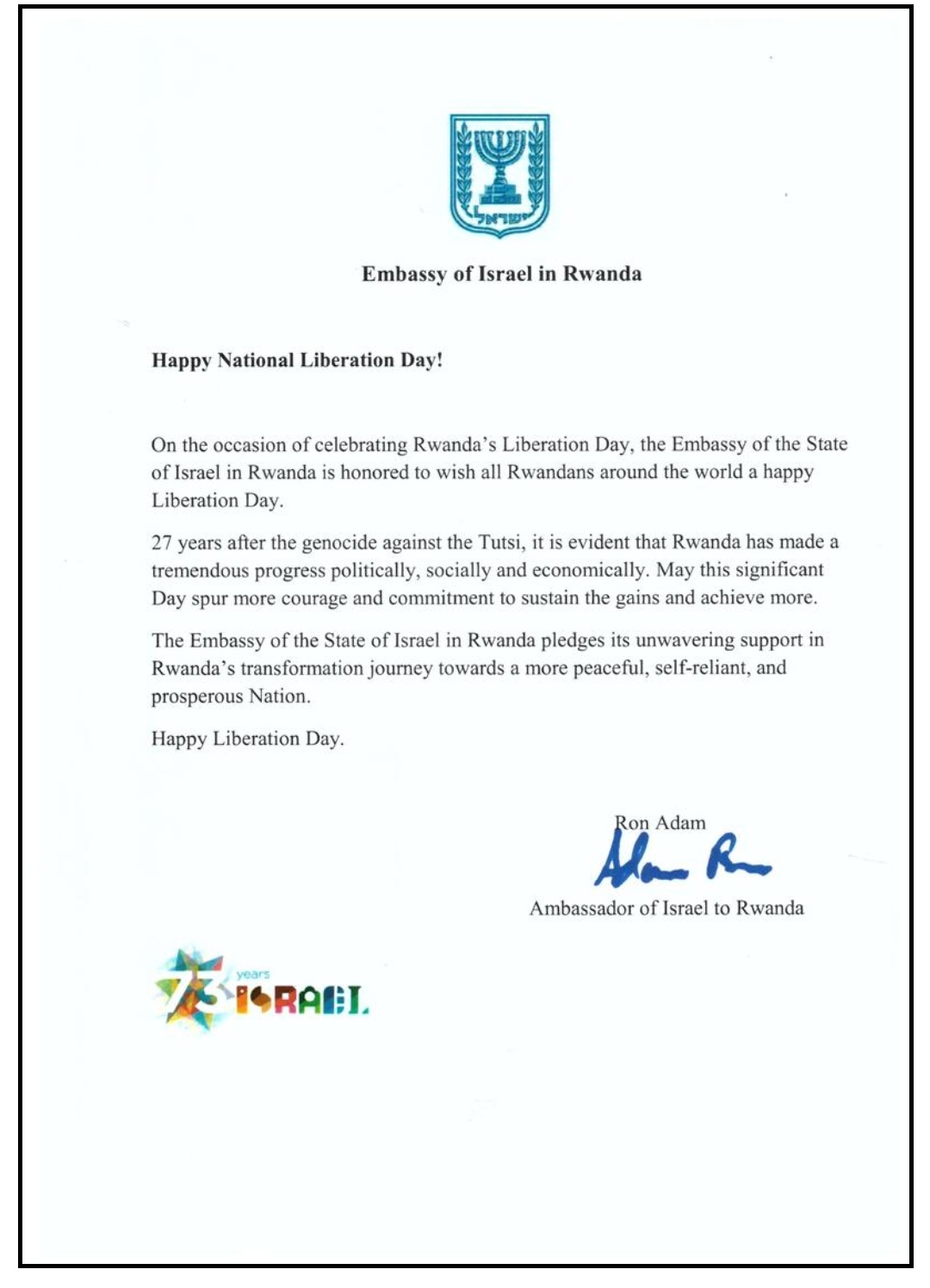 Mu itangazo Ambasade ya Israel yasohoye rivuga ko imyaka 27 ishize u Rwanda rubohowe yerekana ko rukataje mu iterambere kandi ko Israel itazahwema gukorana n’u Rwanda mu kuzamura iryo terambere.