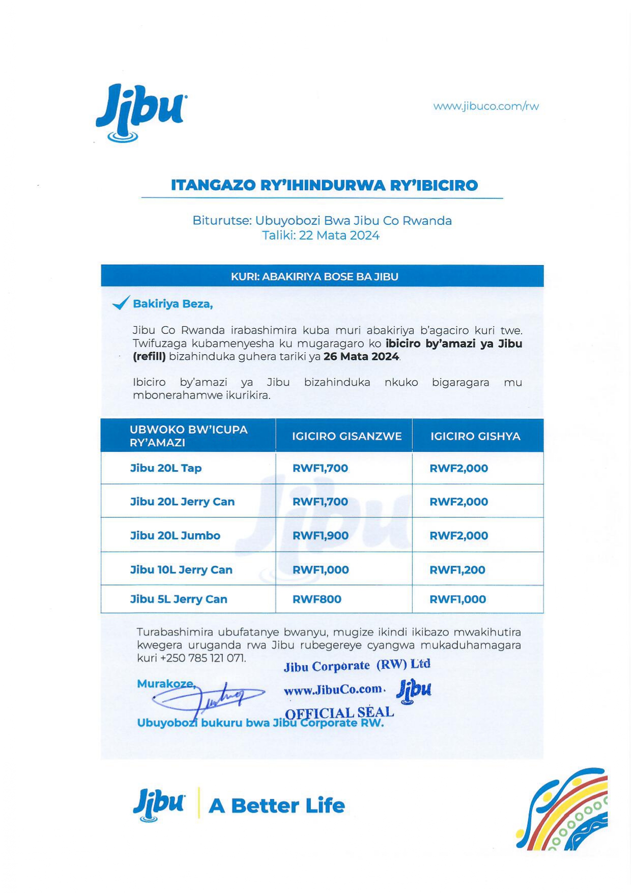 Ikigo gicuruza amazi ya JIBU cyatangaje ibiciro bishya by’amazi.