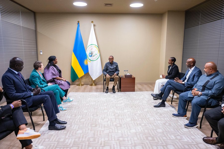 Kagame yaganiriye na Clare Akamanzi na Amadou Fall k’uruhare rw’u Rwanda mu kwakira iyo mikino n’uburyo iri rushanwa rimaze gutera intambwe igaragara mu myaka ine rimaze ritangijwe.