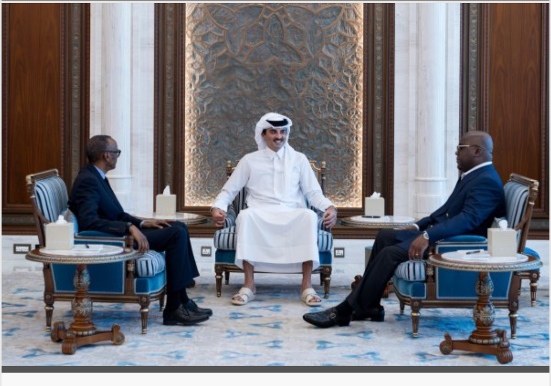 Ifoto yashyizwe hanze na Qatar, igaragaza Sheikh Tamim bin Hamad Al Thani yicaye hagati ibumoso hari Perezida Kagame, mu gihe iburyo hari Tshisekedi.