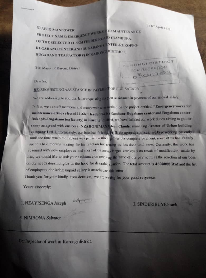 Ku byerekeye Meya w’Akarere ka Karongi, Taarifa ifite ibaruwa bariya baturage bamwandikiye taliki 08, Gicurasi, 2022 bamumenyesha akarengane bavuga ko bakorewe n’uriya rwiyemezamirimo.