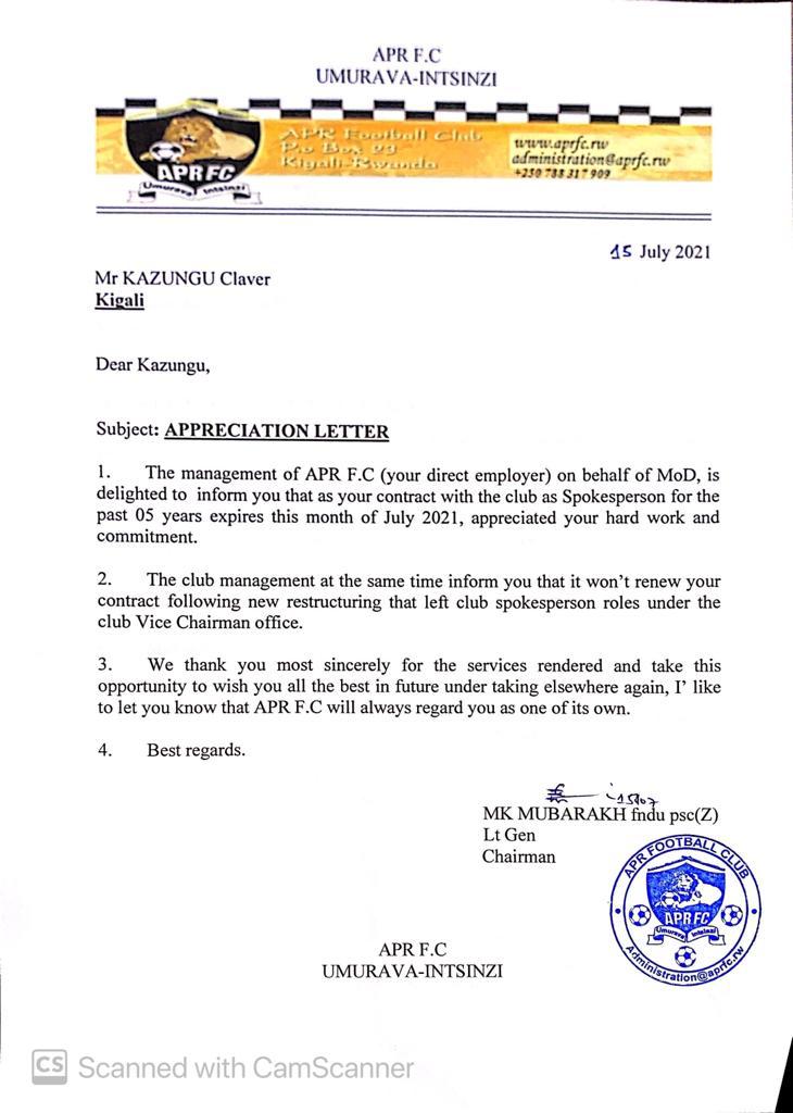 Ni muri rwo rwego ubuyobozi bw’iyi ikipe mu ibaruwa bwashyikirije Kazungu ‘bwamushimiye cyane byimazeyo akazi yakoze keza mu gihe cy’imyaka itanu’ banaboneraho kumwifuriza amahirwe ahandi azakomereza akazi.