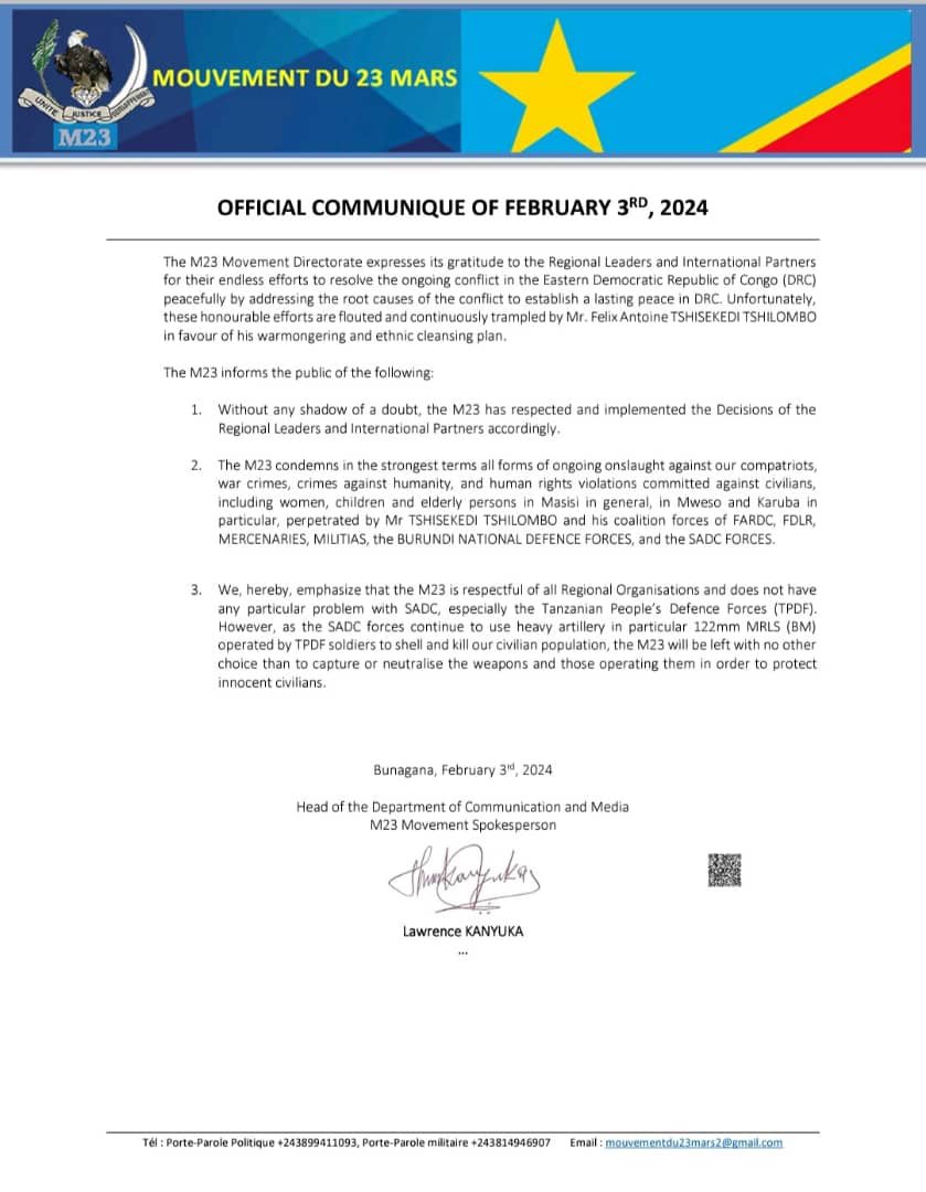 Uyu mutwe kandi wamenyesheje Abanye-Congo n’amahanga ko ingabo za DRC, iz’u Burundi, iza SADC, FDLR, abacancuro n’imitwe ya Wazalendo bari kwibasira abatuye muri Teritwari ya Masisi by’umwihariko muri Mweso na Karuba.